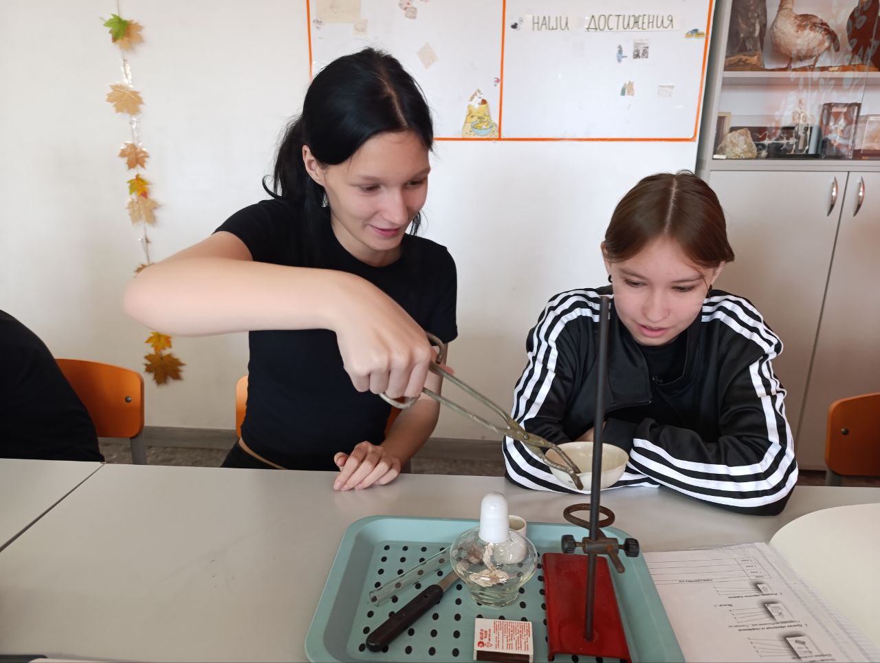 Повторили, как пользоваться штативом и спиртовкой. Научились как правильно зажигать спички. Изучили строения пламени. Теперь они смогут ответить на ряд вопросов: где самая яркая зона, а где самая высокая температура.