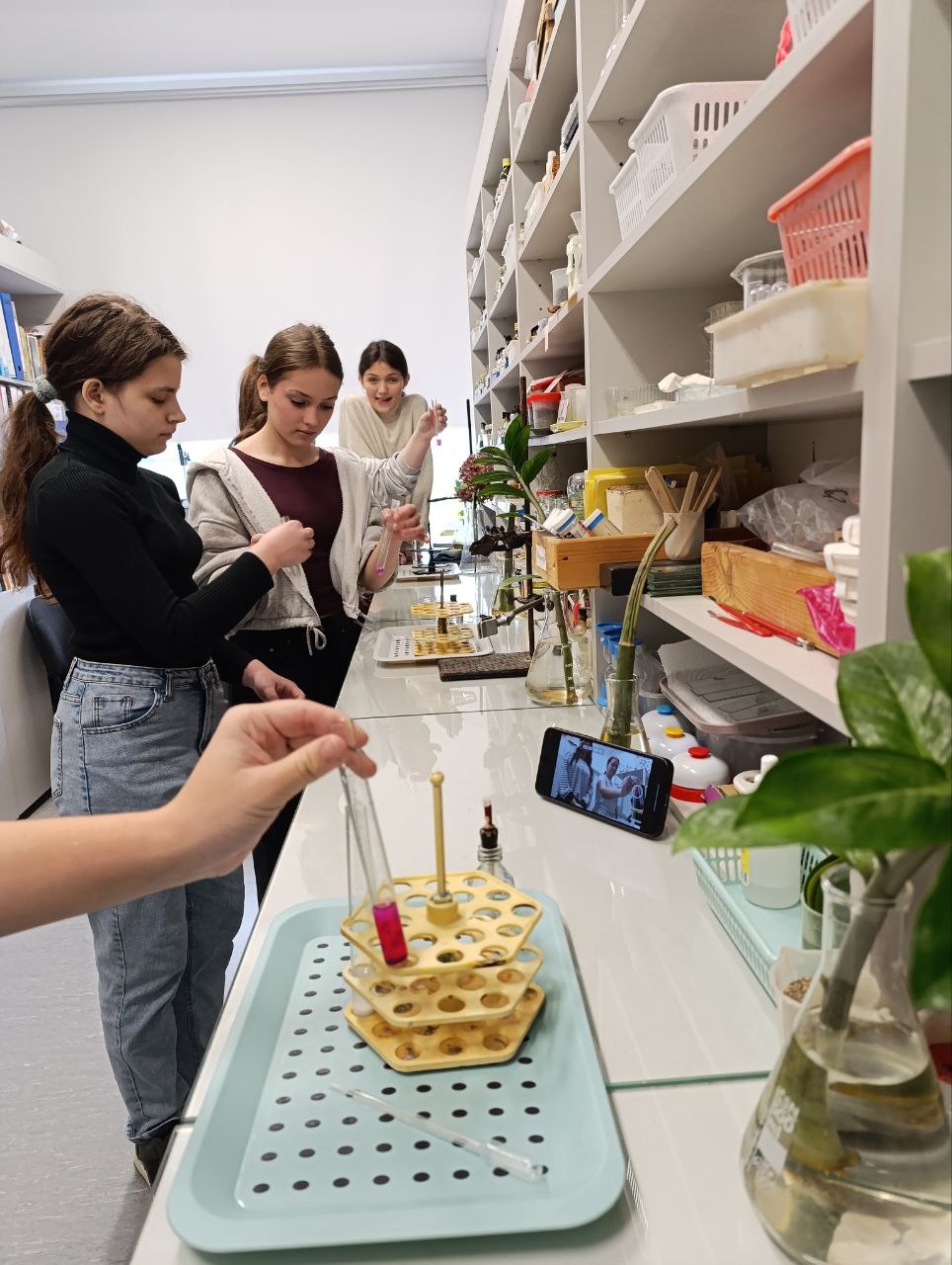 Ребятам было необходимо провести ряд реакций, которые можно провести в условиях лабораторной работы кабинета. Повторив лекционный материал, ребята отобрали безопасные эксперименты, которые можно было провести в кабинете химии. С фенолами решили не проводить, так как он является ядовитым веществом. Со спиртами смогли посмотреть ряд реакций, которые подтверждают характерные химические свойства.