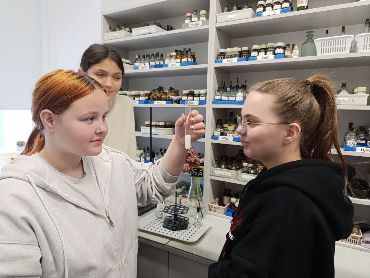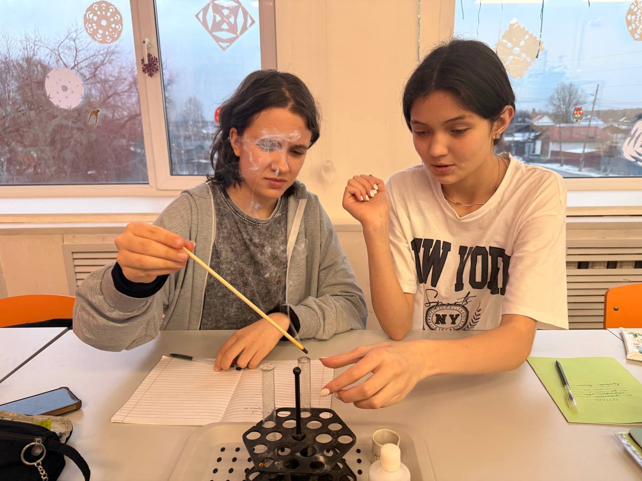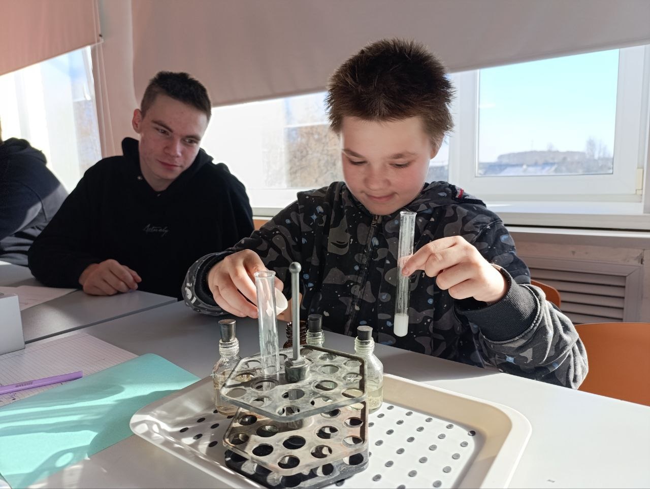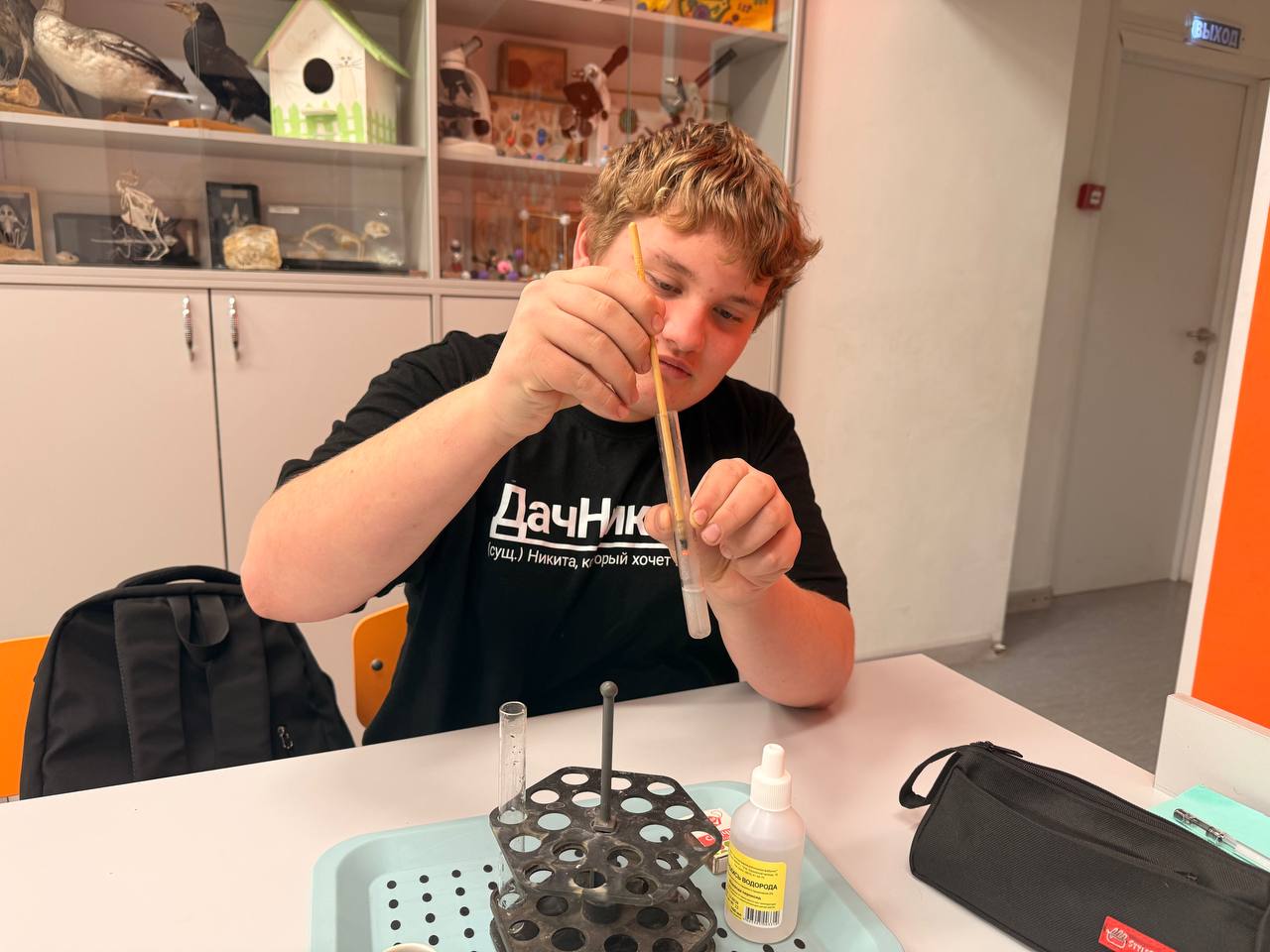Самый главный химический элемент стал причиной поломать голову ребятам, каким способом и с помощью каких реактивов необходимо получить кислород. Самое главное, это вспомнить, он легче воздуха или тяжелей. А как проверить его свойства, если реактивов не так много, придется вспомнить химические свойства. Ребята легко справились с этой задачей и с интересом провели эксперимент.