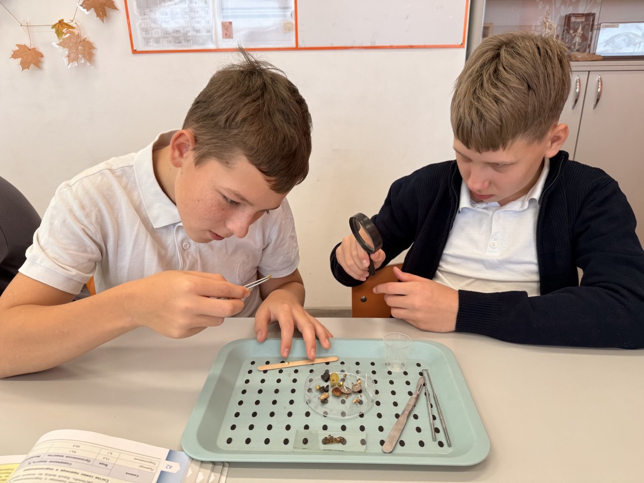 В ходе лабораторной работы ребята изучили строение семени фасоли и пшеницы. Выяснили, что пшеница одета в золотисто-желтый кожистый околоплодник, который плотно сросся с семенной кожурой. А в зародыше семени пшеницы, всего одна семядоля. Фасоль, это двудольное растение, так как зародыши семени имеют две семядоли, которые покрыты семенной кожурой.