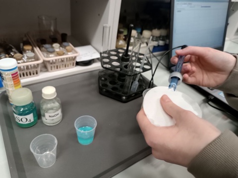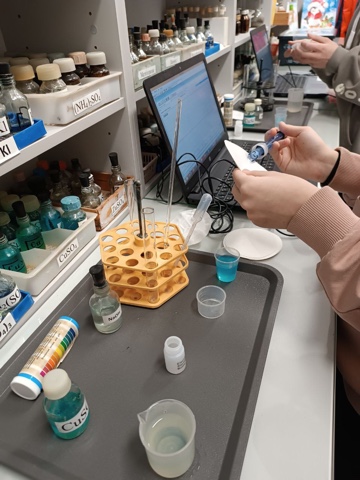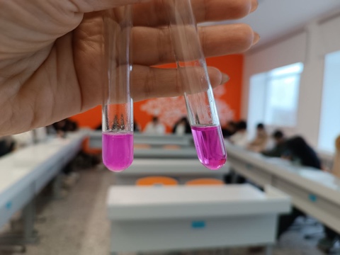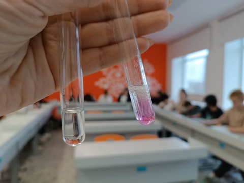Ребятам было предложено отгадать в каком из стаканов прячется кислота а в каком щёлочь. С помощью оборудования рН метра, это сделать не сложно. Только вот для начала, необходимо вспомнить таблицу индикаторов и воспользоваться ими для определения среды раствора. Изюминкой в работе стало составление раствора определённой концентрацией.