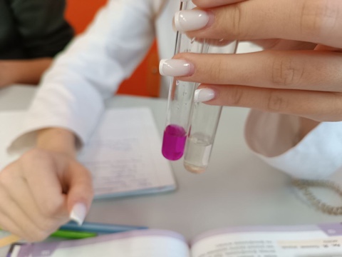 Начать урок доверила своим " Юным химикам". Девочки рассказали об индикаторах и показали как определить среду раствора.