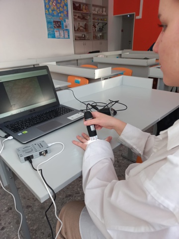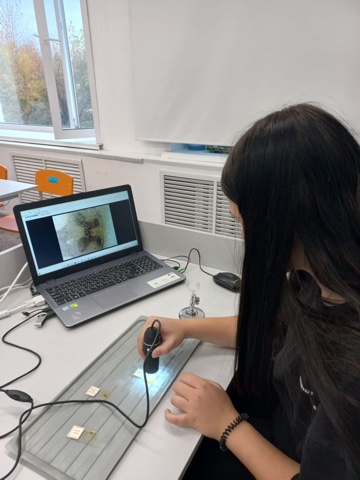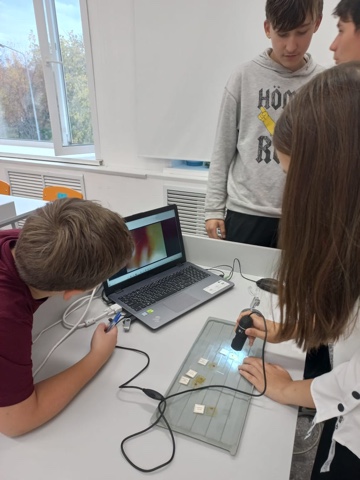 Ход работы: учащиеся использовали для работы цифровой микроскоп, подключали его к ноутбуку и телефону, рассматривали микропрепараты, делали снимки изображения. Также ребята использовали обычные световые микроскопы, сравнивая изображения, полученные по цифровому и световому микроскопу, полученные данные ребята оформляли в виде рисунков в таблице.