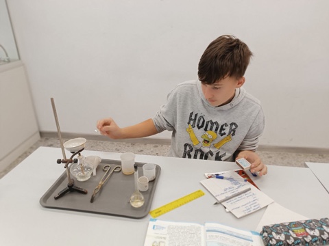 В теории, разделить смесь легко, а вы попробуйте это сделать на практике. Ребятам предстояло справится с не лёгкой задачей, разделить смесь песка, опилок, соли и железа. На обычных уроках хватает времени только на два, иногда активным удаётся справится с тремя процессами: растворение, фильтрование и выпаривание.