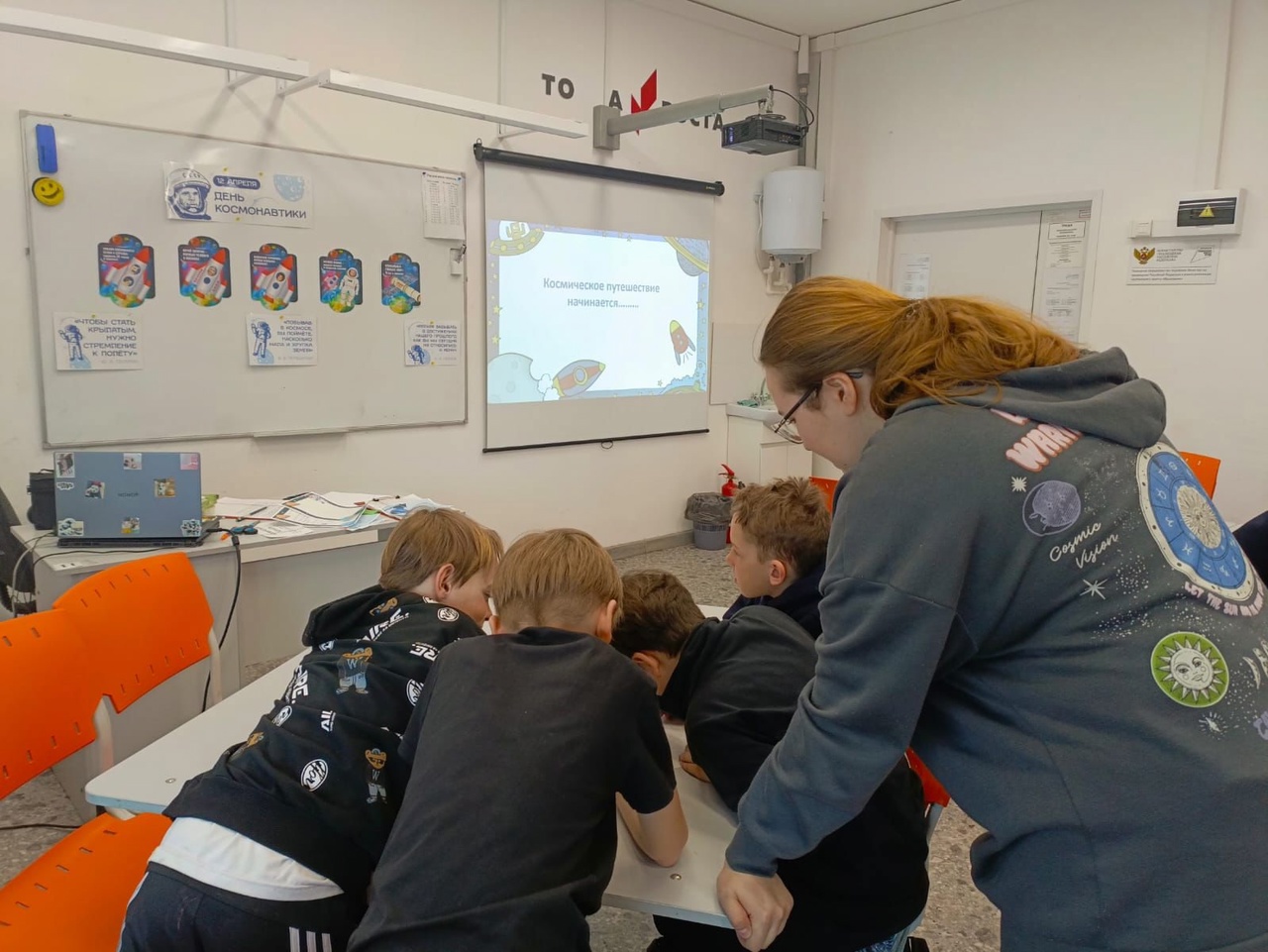 В лаборатории физики ребята попали в увлекательное «Космическое приключение» где попробовали себя в роли космических путешественников, составили маршрут для путешествия по Солнечной системе, узнали, на какой планете ученые надеются найти жизнь и какая планета — чемпион по количеству спутников, а также составили своё созвездие.