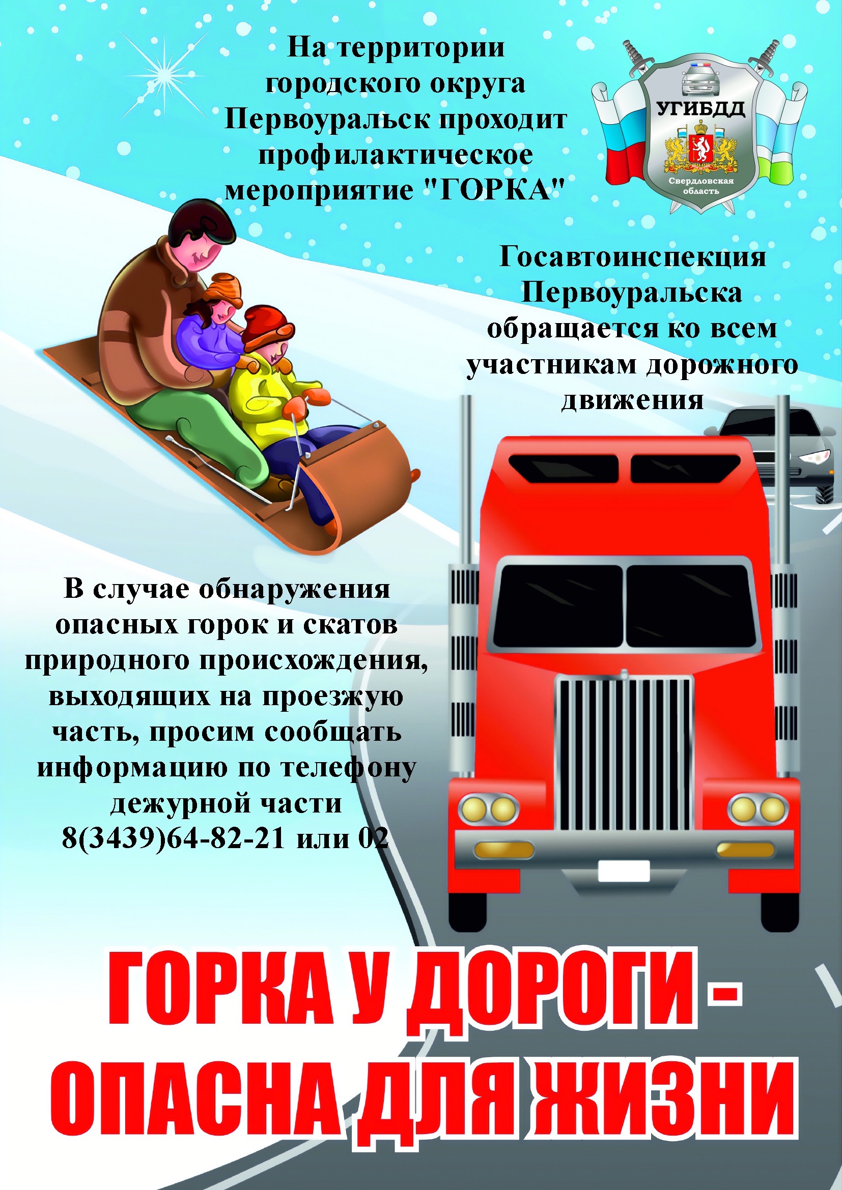 В случае обнаружения опасных горок и скатов природного происхождения, выходящих на проезжую часть, просим сообщить информацию по телефону дежурной части 8 (3439) 64-82-21 или 02.
